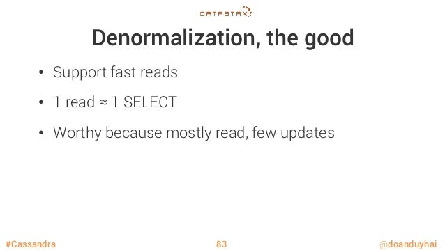 - 83. #Cassandra @doanduyhai Denormalization, the good • Support fast reads • 1 read ≈ 1 SELECT • Worthy because mostly read, few updates 83