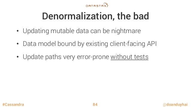 - 84. #Cassandra @doanduyhai Denormalization, the bad • Updating mutable data can be nightmare • Data model bound by existing client-facing API • Update paths very error-prone without tests 84