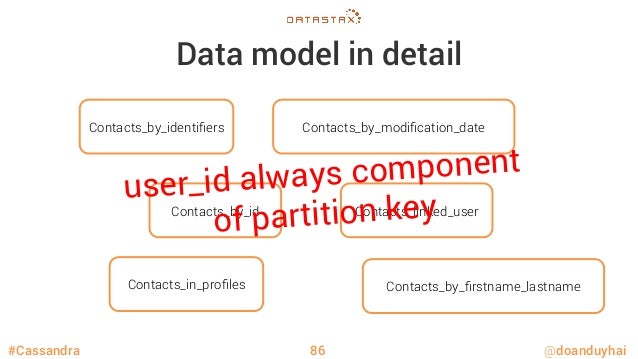 - 86. #Cassandra @doanduyhai Data model in detail 86 Contacts_by_id Contacts_by_identifiers Contacts_in_profiles Contacts_by_modification_date Contacts_by_firstname_lastname Contacts_linked_user user_id always component of partition key