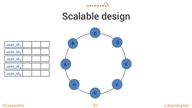 - 87. #Cassandra @doanduyhai Scalable design 87 n1 n2 n3 n4 n5 n6 n7 n8 A B C D E F G H user_id1 user_id2 user_id3 user_id4 user_id5