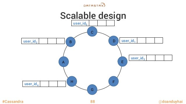 - 88. #Cassandra @doanduyhai Scalable design 88 n1 n2 n3 n4 n5 n6 n7 n8 A B C D E F G H user_id1user_id2 user_id3 user_id4 user_id5
