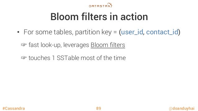 - 89. #Cassandra @doanduyhai Bloom filters in action • For some tables, partition key = (user_id, contact_id) ☞ fast look-up, leverages Bloom filters ☞ touches 1 SSTable most of the time 89