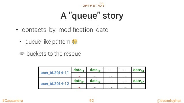 - 92. #Cassandra @doanduyhai A "queue" story • contacts_by_modification_date • queue-like pattern ???? ☞ buckets to the rescue 92 user_id:2014-12 date35 date12 … … date47 … … … … user_id:2014-11 date11 date12 … … date34 … … … …