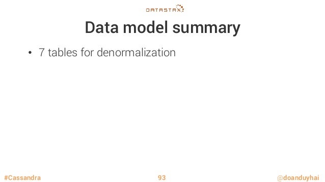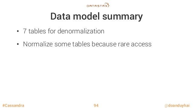 - 94. #Cassandra @doanduyhai Data model summary • 7 tables for denormalization • Normalize some tables because rare access 94