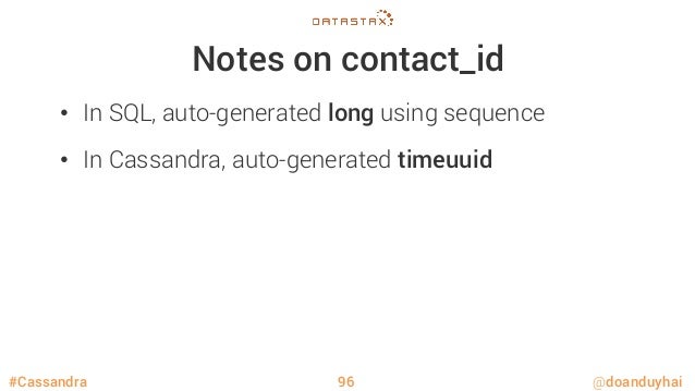 - 96. #Cassandra @doanduyhai Notes on contact_id • In SQL, auto-generated long using sequence • In Cassandra, auto-generated timeuuid 96