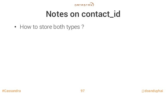 - 97. #Cassandra @doanduyhai Notes on contact_id • How to store both types ? 97