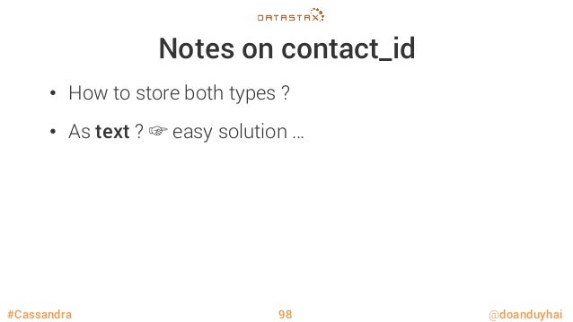 - 98. #Cassandra @doanduyhai Notes on contact_id • How to store both types ? • As text ? ☞ easy solution … 98