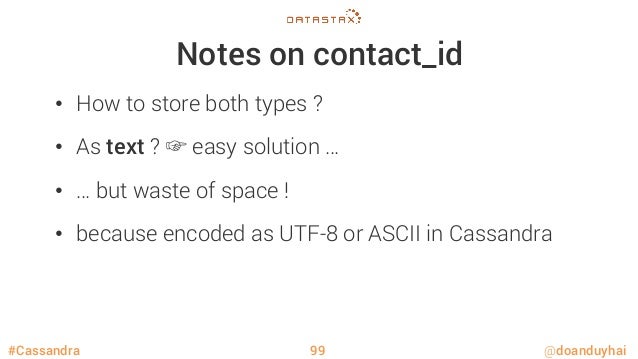 - 99. #Cassandra @doanduyhai Notes on contact_id • How to store both types ? • As text ? ☞ easy solution … • … but waste of space ! • because encoded as UTF-8 or ASCII in Cassandra 99