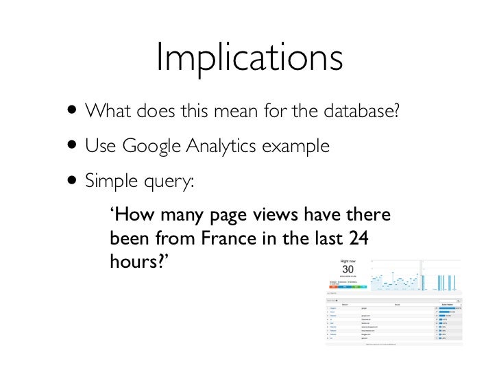 - 9. Implications• What does this mean for the database?• Use Google Analytics example• Simple query: ‘How many page views have there been from France in the last 24 hours?’