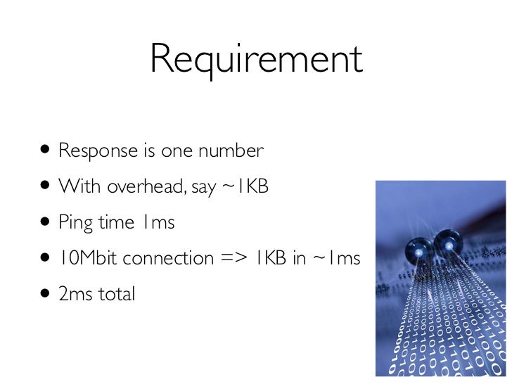 - 10. Requirement• Response is one number• With overhead, say ~1KB• Ping time 1ms• 10Mbit connection => 1KB in ~1ms• 2ms total