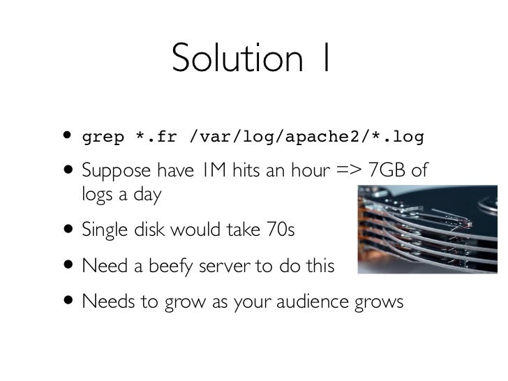 - 11. Solution 1• grep *.fr /var/log/apache2/*.log• Suppose have 1M hits an hour => 7GB of logs a day• Single disk would take 70s• Need a beefy server to do this• Needs to grow as your audience grows
