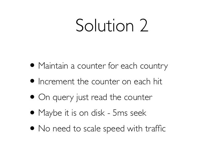 - 12. Solution 2• Maintain a counter for each country• Increment the counter on each hit• On query just read the counter• Maybe it is on disk - 5ms seek• No need to scale speed with traffic