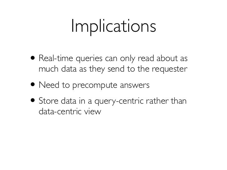 - 13. Implications• Real-time queries can only read about as much data as they send to the requester• Need to precompute answers• Store data in a query-centric rather than data-centric view