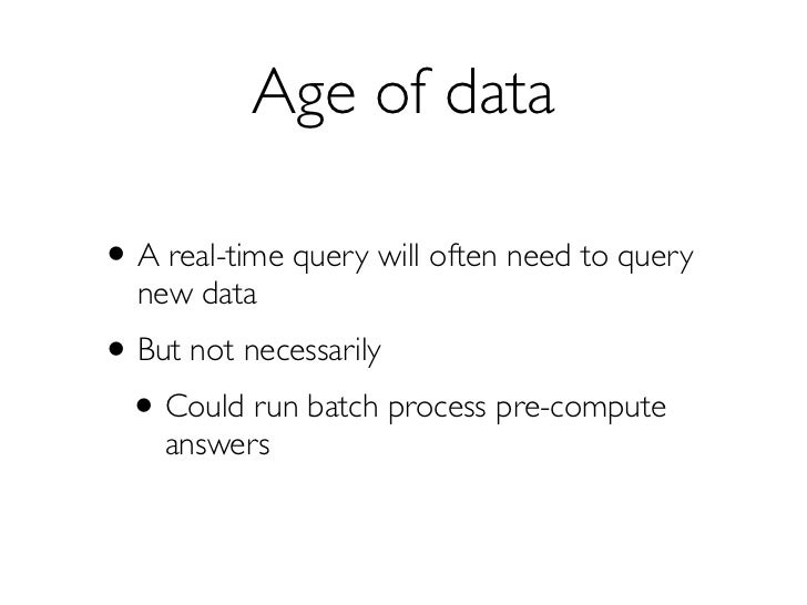 - 14. Age of data• A real-time query will often need to query new data• But not necessarily • Could run batch process pre-compute answers