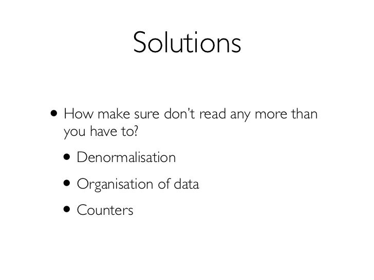 - 16. Solutions• How make sure don’t read any more than you have to? • Denormalisation • Organisation of data • Counters