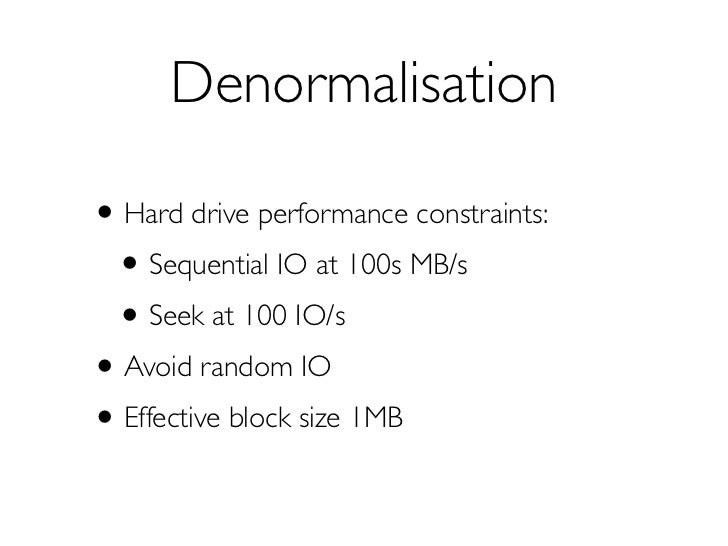 - 17. Denormalisation• Hard drive performance constraints: • Sequential IO at 100s MB/s • Seek at 100 IO/s• Avoid random IO• Effective block size 1MB