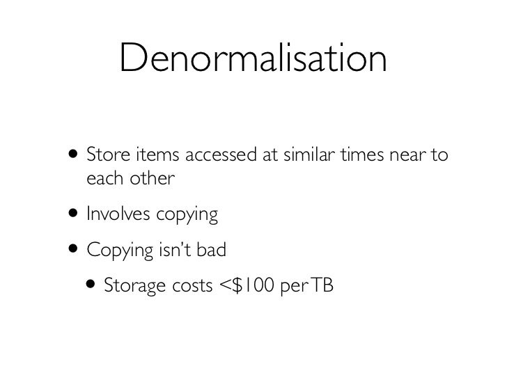 - 18. Denormalisation• Store items accessed at similar times near to each other• Involves copying• Copying isn’t bad • Storage costs <$100 per TB