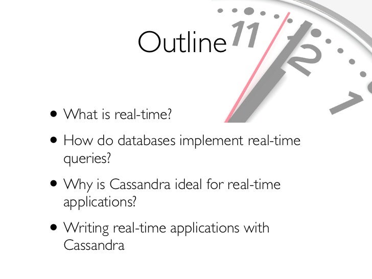 - 2. Outline• What is real-time?• How do databases implement real-time queries?• Why is Cassandra ideal for real-time applications?• Writing real-time applications with Cassandra