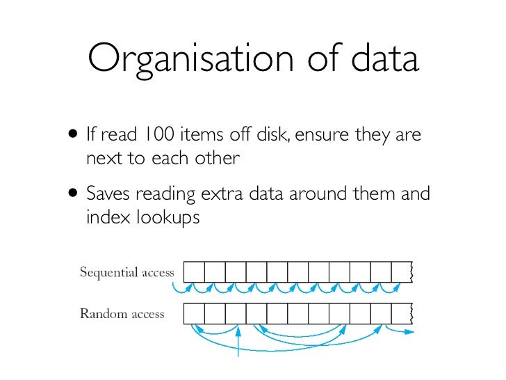 - 19. Organisation of data• If read 100 items off disk, ensure they are next to each other• Saves reading extra data around them and index lookups