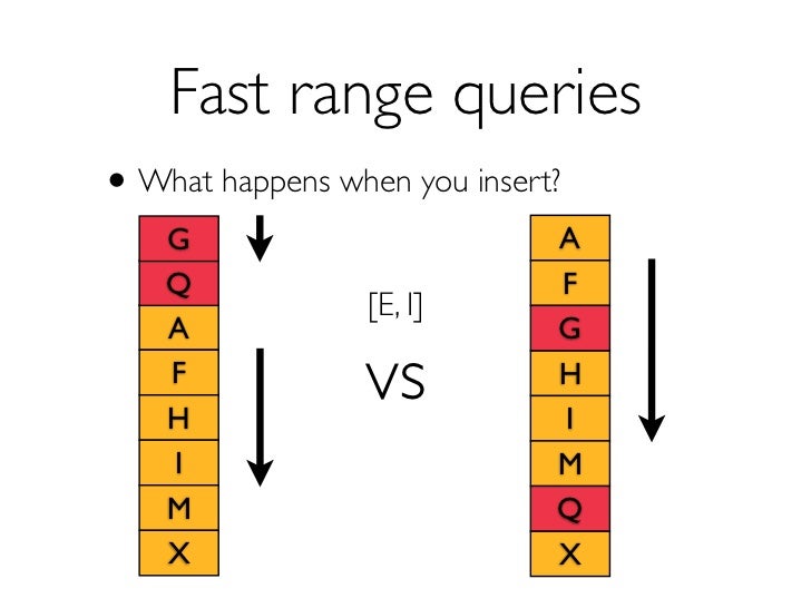 - 21. Fast range queries• What happens when you insert? G A Q F [E, I] A G F H vs H I I M M Q X X