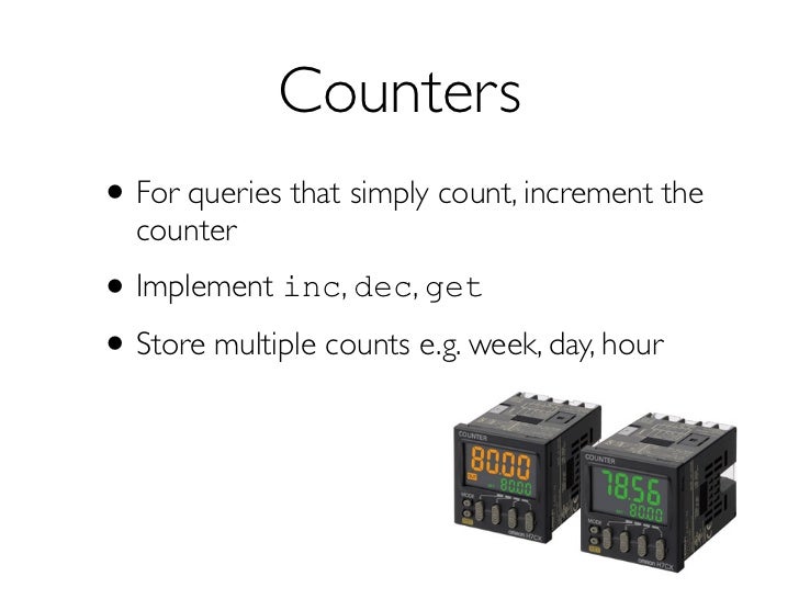 - 22. Counters• For queries that simply count, increment the counter• Implement inc, dec, get• Store multiple counts e.g. week, day, hour