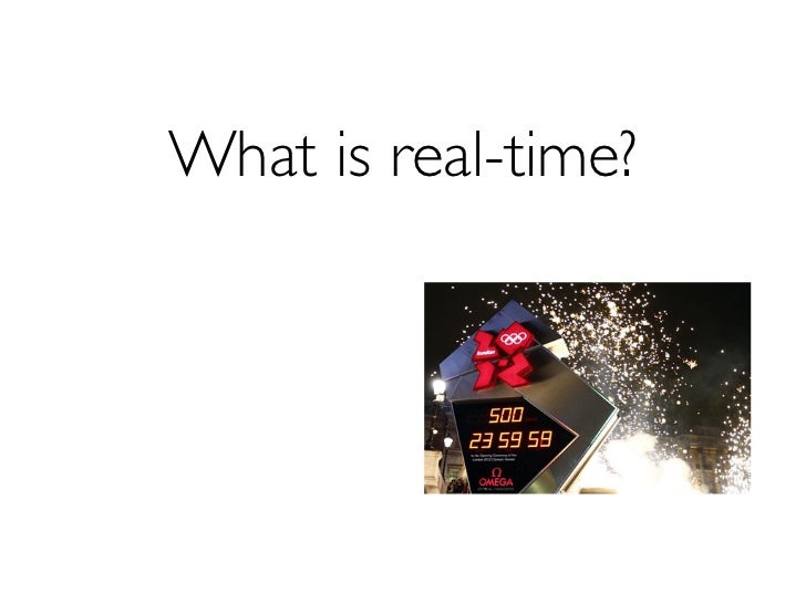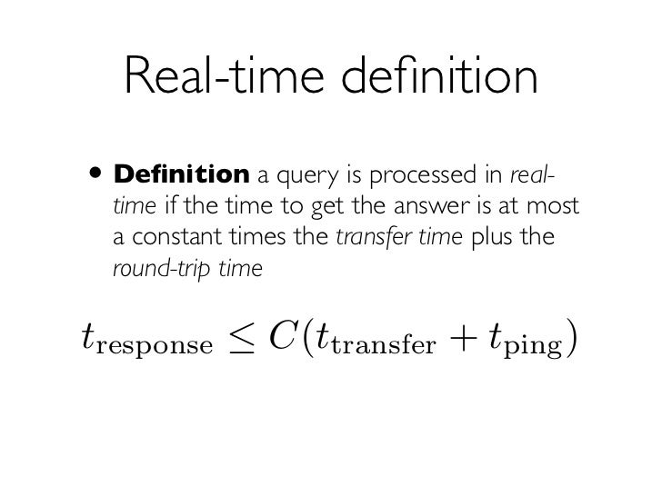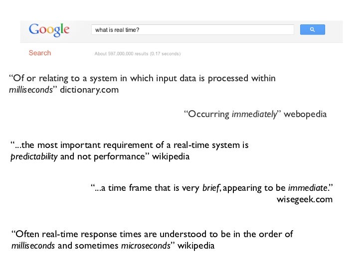 - 4. “Of or relating to a system in which input data is processed withinmilliseconds” dictionary.com “Occurring immediately” webopedia“...the most important requirement of a real-time system ispredictability and not performance” wikipedia “...a time frame that is very brief, appearing to be immediate.” wisegeek.com“Often real-time response times are understood to be in the order ofmilliseconds and sometimes microseconds” wikipedia