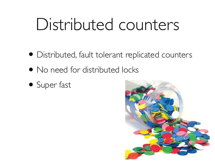 - 29. Distributed counters• Distributed, fault tolerant replicated counters• No need for distributed locks• Super fast