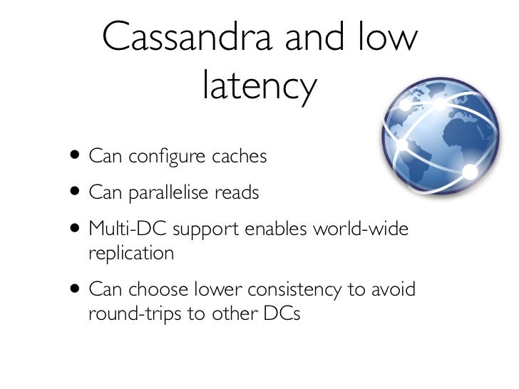 - 34. Cassandra and low latency• Can configure caches• Can parallelise reads• Multi-DC support enables world-wide replication• Can choose lower consistency to avoid round-trips to other DCs