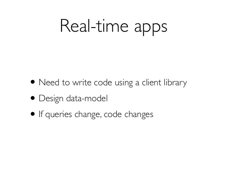 - 36. Real-time apps• Need to write code using a client library• Design data-model• If queries change, code changes