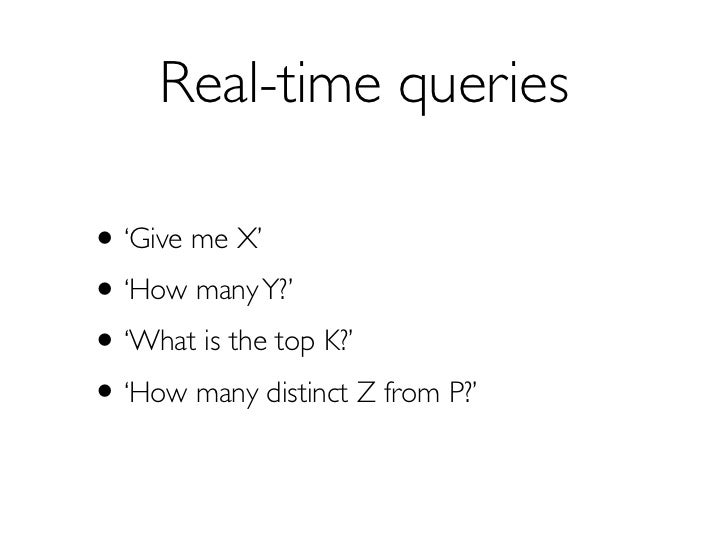 - 5. Real-time queries• ‘Give me X’• ‘How many Y?’• ‘What is the top K?’• ‘How many distinct Z from P?’