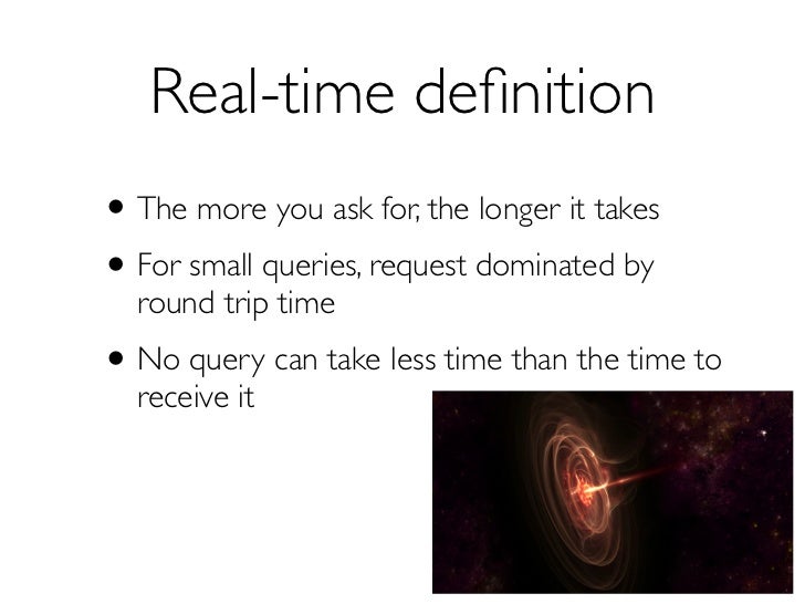 - 7. Real-time definition• The more you ask for, the longer it takes• For small queries, request dominated by round trip time• No query can take less time than the time to receive it