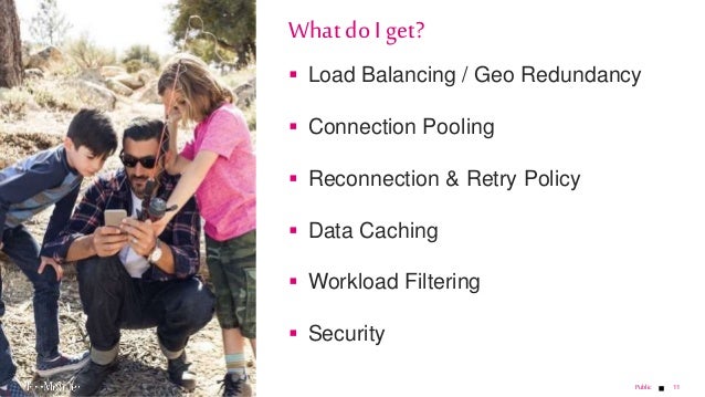 - 11. 11 Load Balancing / Geo Redundancy Connection Pooling Reconnection & Retry Policy Data Caching Workload Filtering Security What do I get? Public