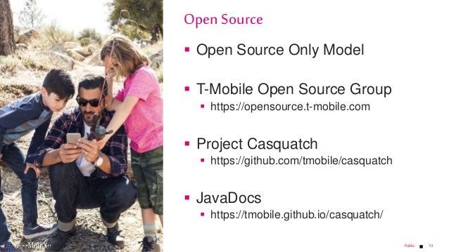 - 13. 13 Open Source Only Model T-Mobile Open Source Group https://opensource.t-mobile.com Project Casquatch https://github.com/tmobile/casquatch JavaDocs https://tmobile.github.io/casquatch/ Open Source Public