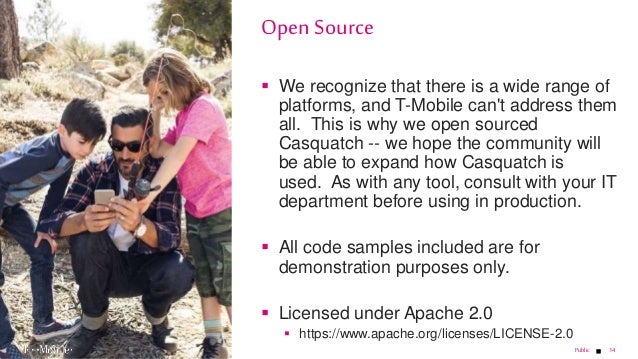 - 14. 14 We recognize that there is a wide range of platforms, and T-Mobile can't address them all. This is why we open sourced Casquatch -- we hope the community will be able to expand how Casquatch is used. As with any tool, consult with your IT department before using in production. All code samples included are for demonstration purposes only. Licensed under Apache 2.0 https://www.apache.org/licenses/LICENSE-2.0 Open Source Public