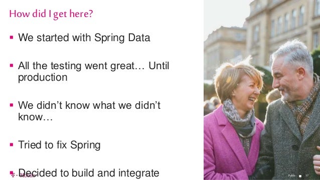 - 17. 1717 We started with Spring Data All the testing went great… Until production We didn’t know what we didn’t know… Tried to fix Spring Decided to build and integrate How did I get here? Public