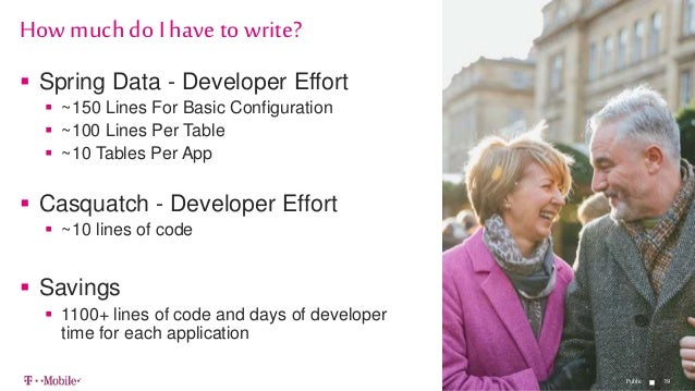 - 19. 1919 Spring Data - Developer Effort ~150 Lines For Basic Configuration ~100 Lines Per Table ~10 Tables Per App Casquatch - Developer Effort ~10 lines of code Savings 1100+ lines of code and days of developer time for each application How muchdo I have to write? Public