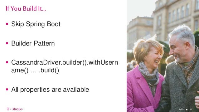 - 23. 2323 Skip Spring Boot Builder Pattern CassandraDriver.builder().withUsern ame() … .build() All properties are available If You BuildIt… Public