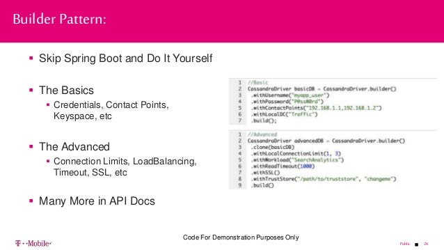- 26. 26Public Skip Spring Boot and Do It Yourself The Basics Credentials, Contact Points, Keyspace, etc The Advanced Connection Limits, LoadBalancing, Timeout, SSL, etc Many More in API Docs Builder Pattern: Code For Demonstration Purposes Only
