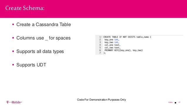 - 27. 27Public Create a Cassandra Table Columns use _ for spaces Supports all data types Supports UDT Create Schema: Code For Demonstration Purposes Only