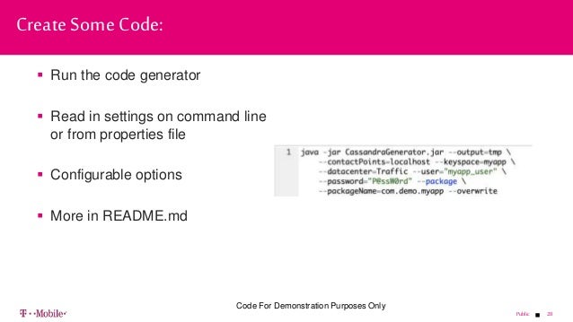 - 28. 28Public Run the code generator Read in settings on command line or from properties file Configurable options More in README.md Create Some Code: Code For Demonstration Purposes Only