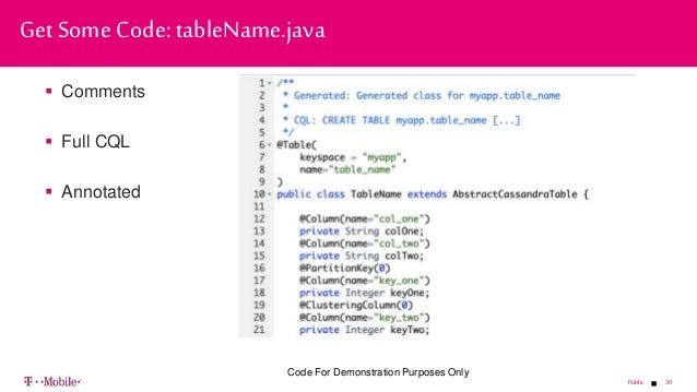 - 30. 30Public Comments Full CQL Annotated Get Some Code: tableName.java Code For Demonstration Purposes Only