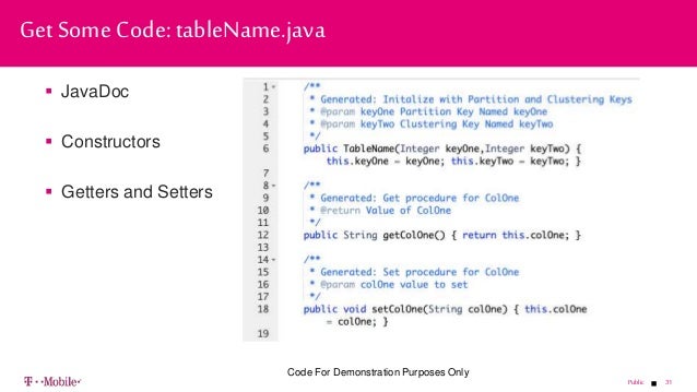- 31. 31Public JavaDoc Constructors Getters and Setters Get Some Code: tableName.java Code For Demonstration Purposes Only