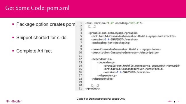 - 32. 32Public Package option creates pom.xml Snippet shorted for slide Complete Artifact Get Some Code: pom.xml Code For Demonstration Purposes Only