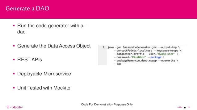 - 35. 35Public Run the code generator with a – dao Generate the Data Access Object REST APIs Deployable Microservice Unit Tested with Mockito Generate a DAO Code For Demonstration Purposes Only