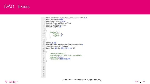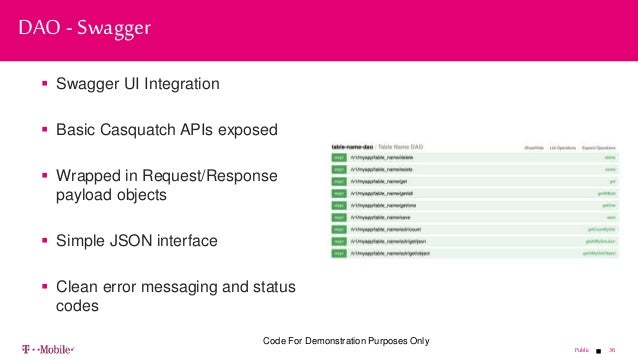 - 36. 36Public Swagger UI Integration Basic Casquatch APIs exposed Wrapped in Request/Response payload objects Simple JSON interface Clean error messaging and status codes DAO - Swagger Code For Demonstration Purposes Only