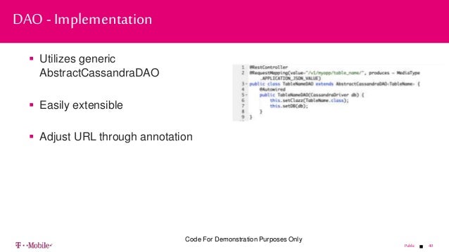 - 40. 40Public Utilizes generic AbstractCassandraDAO Easily extensible Adjust URL through annotation DAO - Implementation Code For Demonstration Purposes Only