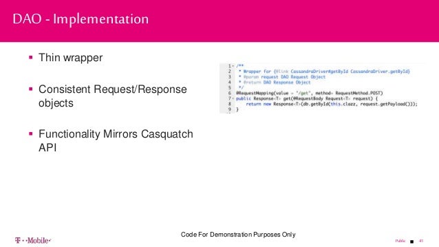 - 41. 41Public Thin wrapper Consistent Request/Response objects Functionality Mirrors Casquatch API DAO - Implementation Code For Demonstration Purposes Only