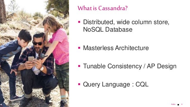 - 9. 9 Distributed, wide column store, NoSQL Database Masterless Architecture Tunable Consistency / AP Design Query Language : CQL What is Cassandra? Public