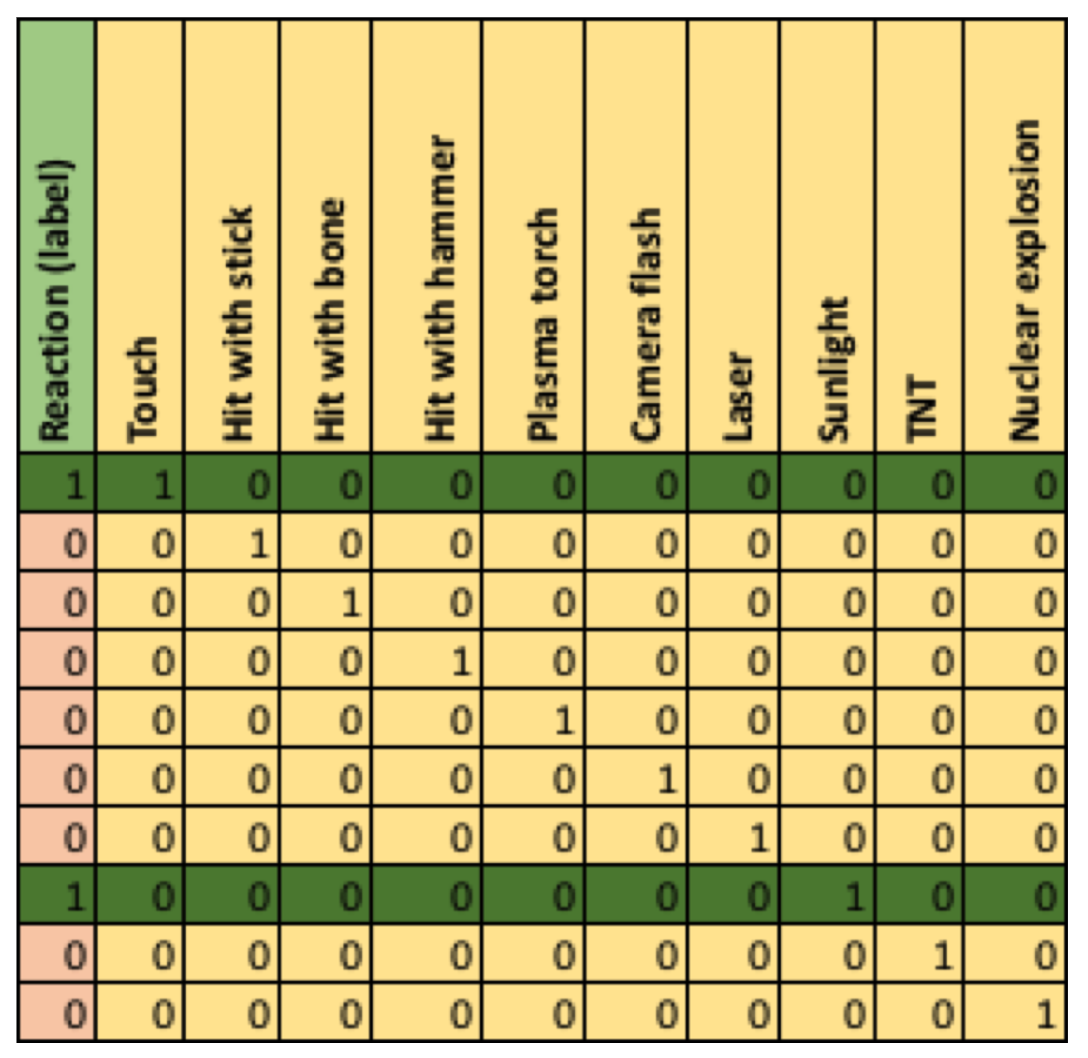 Maybe a cautious approach to a bigger version of the Monolith (2km long) in a POD that is only 2m in diameter is advisable. What do we know about how Monoliths react to stimuli? A simple classification problem consists of the category (label) “no reaction” (0) or “reaction” (1), and the stimuli tried (features which will be used to predict the label). In the following table, the first column in the label to be predicted (positive, 1, or negative, 0), the remaining columns are the features, and each row is an example: